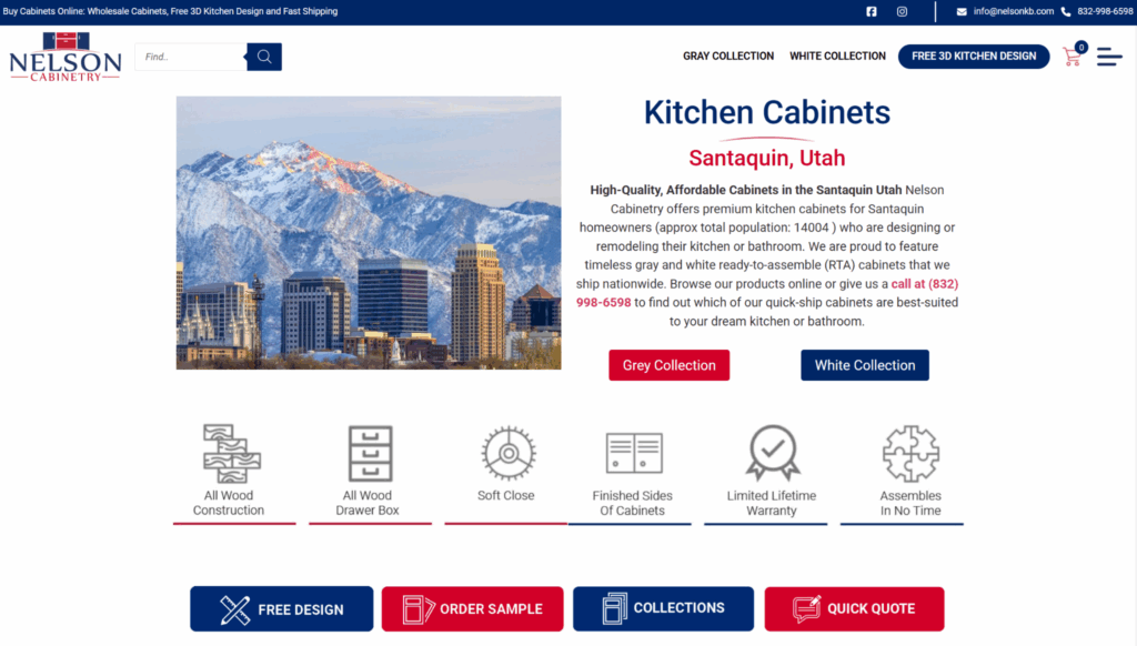 Nelson Cabinetry operates as a family-owned business providing high-quality cabinetry at wholesale prices, with services available to Santaquin residents. The company specializes in ready-to-assemble (RTA) kitchen cabinets built with premium materials for long-term durability.