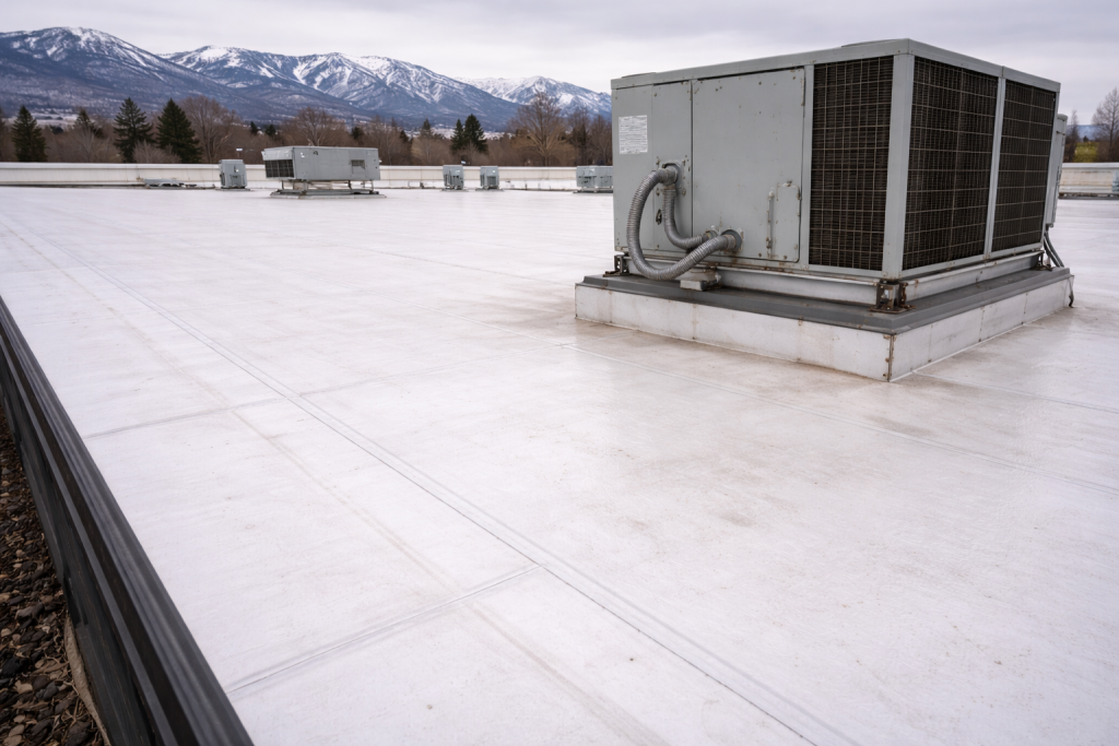TPO is installed in large sheets and heat-welded at the seams, creating a watertight barrier across the entire building.