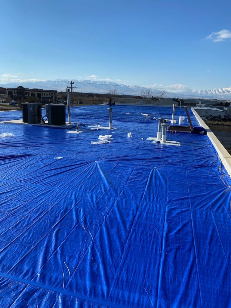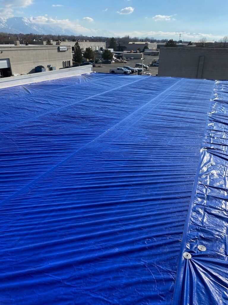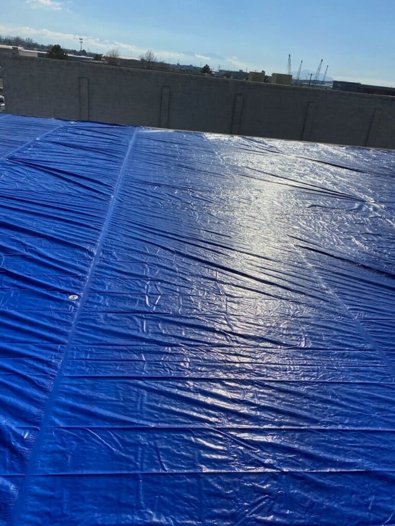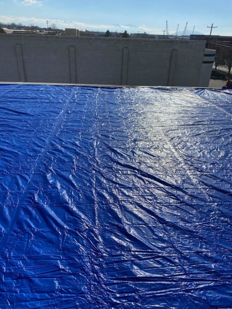 Hail damage caused a serious leak in the low slope TPO roof of a commercial building. We installed an emergency tarp to safeguard the interior from further water intrusion until the roof can be replaced. This temporary solution ensures the client’s property remains protected during the repair process.