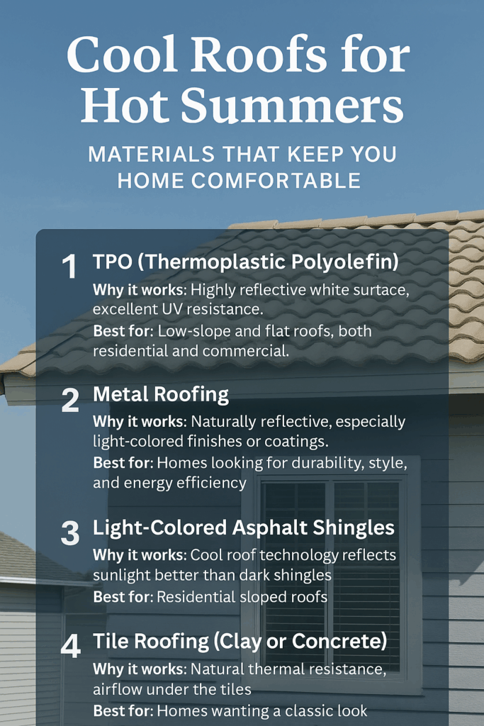 A cool roof is designed to reflect more sunlight and absorb less heat than a standard roof, helping keep your home comfortable even on the hottest days. Whether you’re building new or replacing an existing roof, the right materials can make a big difference in both comfort and energy costs.