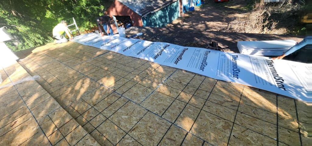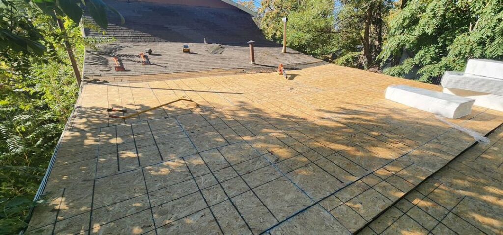 To properly restore the roof’s function and safety, our crew first performed a full tear-off, removing all five layers of existing shingles and underlayment. Once the roof deck was exposed, we installed: