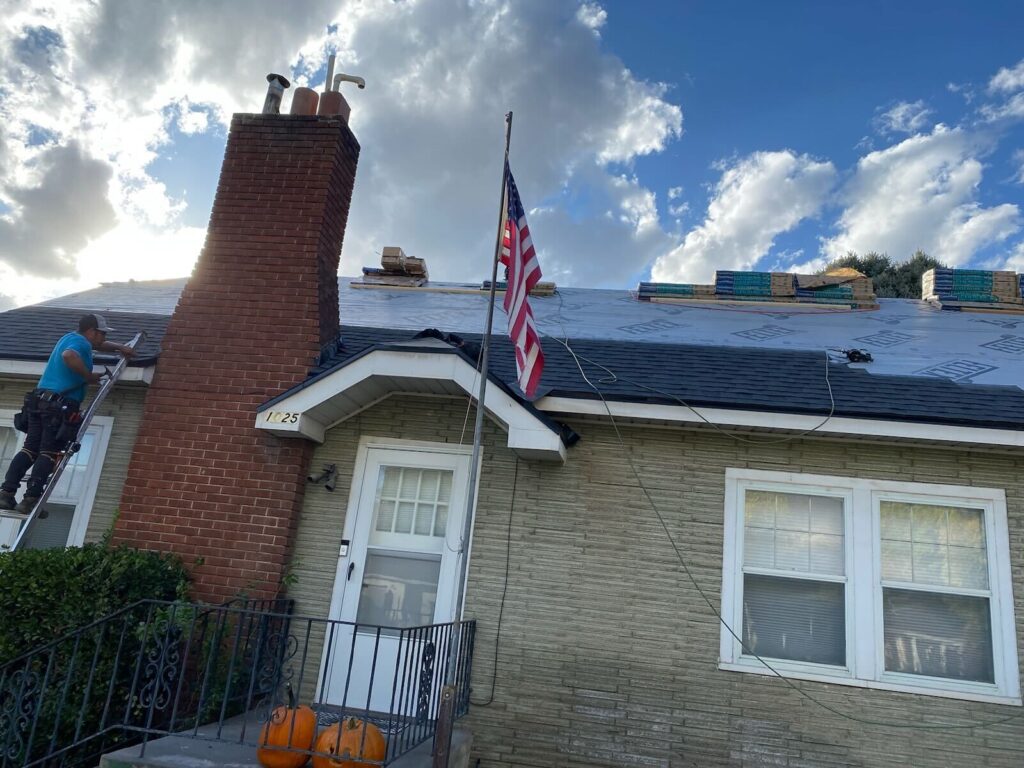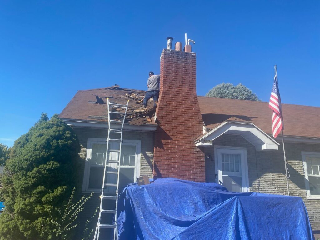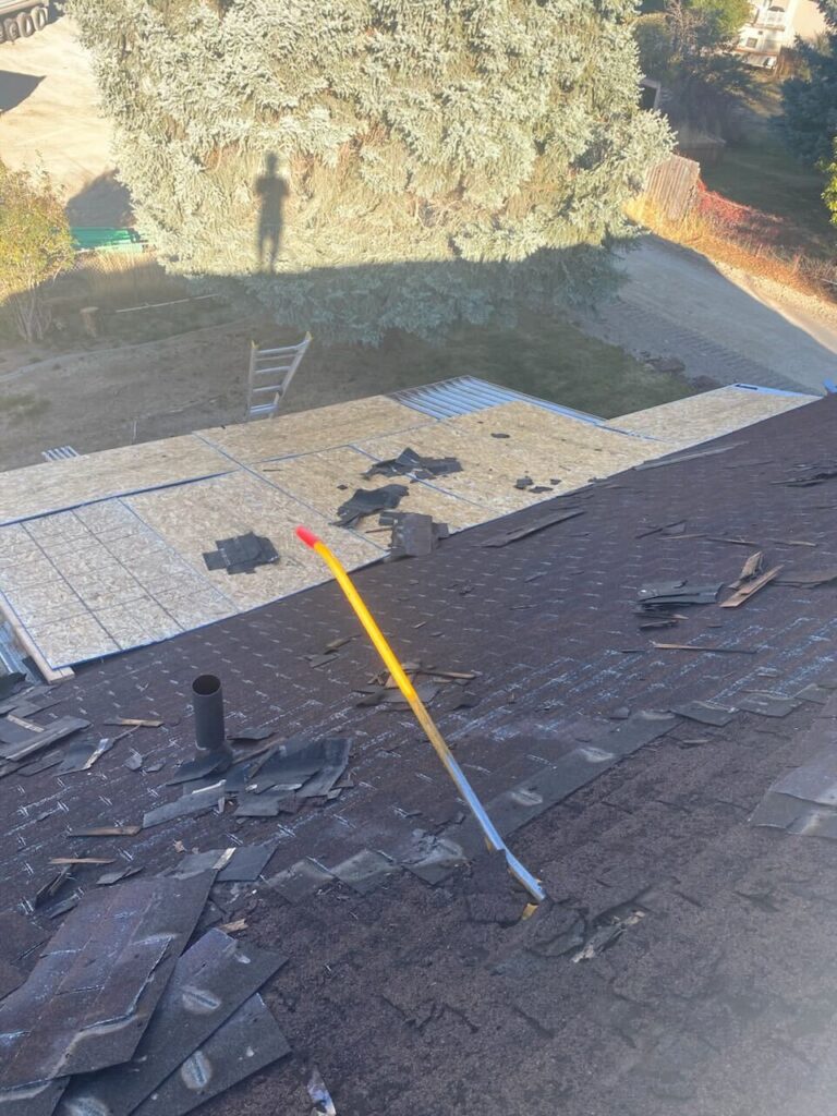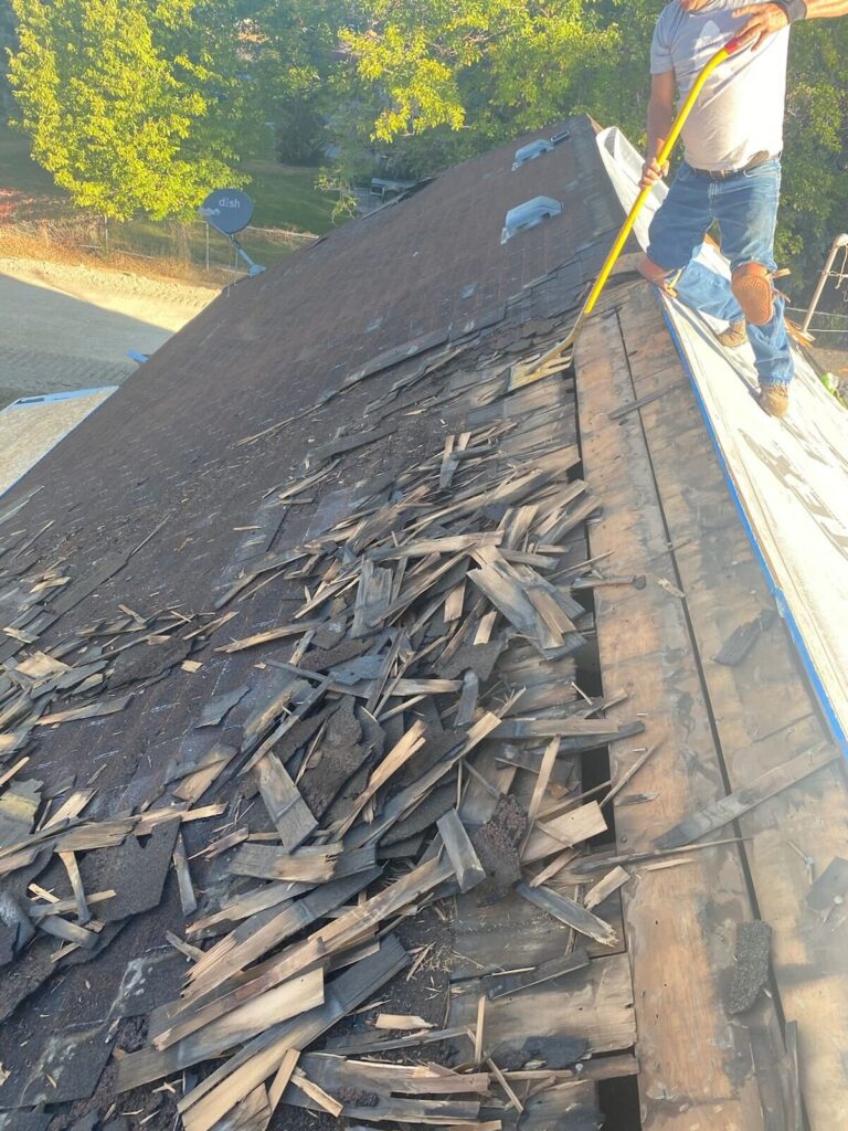 After discovering multiple layers of worn roofing materials, we efficiently tore off two layers of asphalt shingles and one layer of wood shakes. We then installed OSB, applied Henry Eaveguard Ice & Water Shield, and laid down synthetic underlayment. Finally, we finished with 30-year Certainteed architectural shingles, complete with ridge vent, ensuring durability for the 8/12 porch roof.