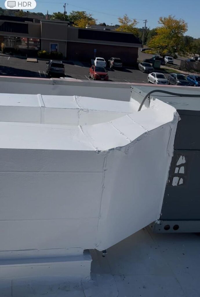 This job focused on sealing and protecting rooftop HVAC ductwork, where uncoated seams were allowing rainwater to leak into the duct system — with the potential to affect airflow and even indoor air quality inside the restaurant.