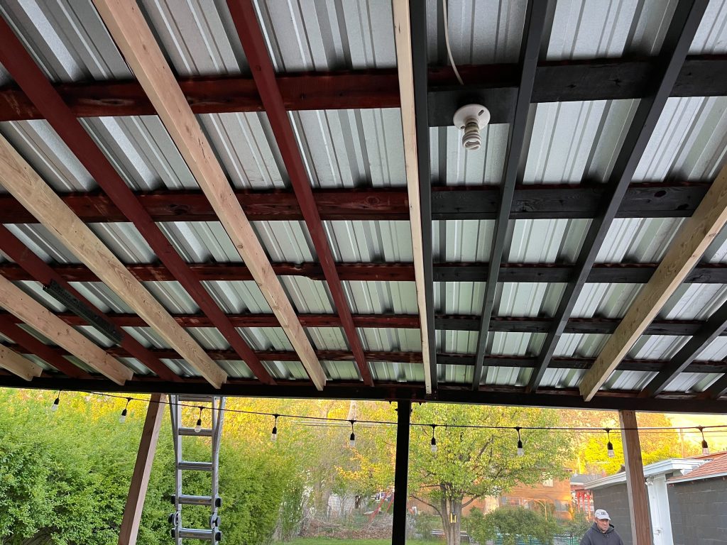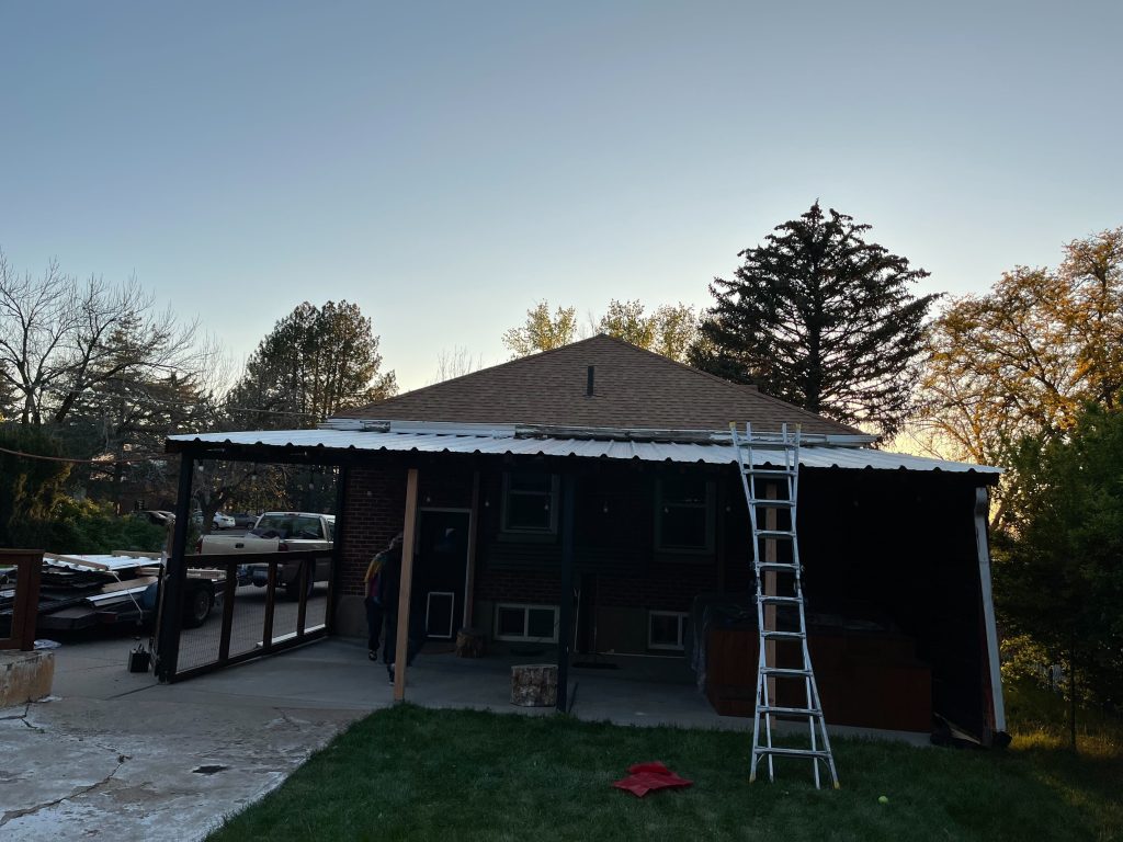 An older patio cover built with lightweight, wind-damaged metal roofing and minimal structural support.