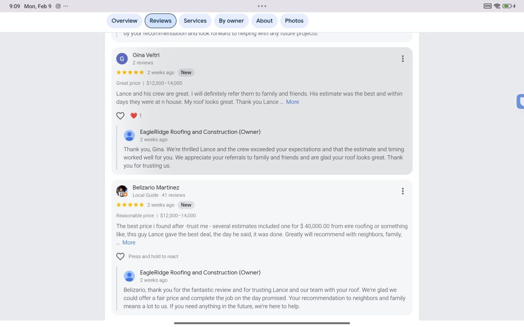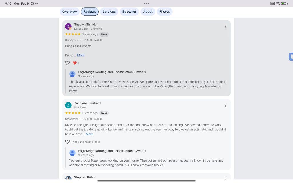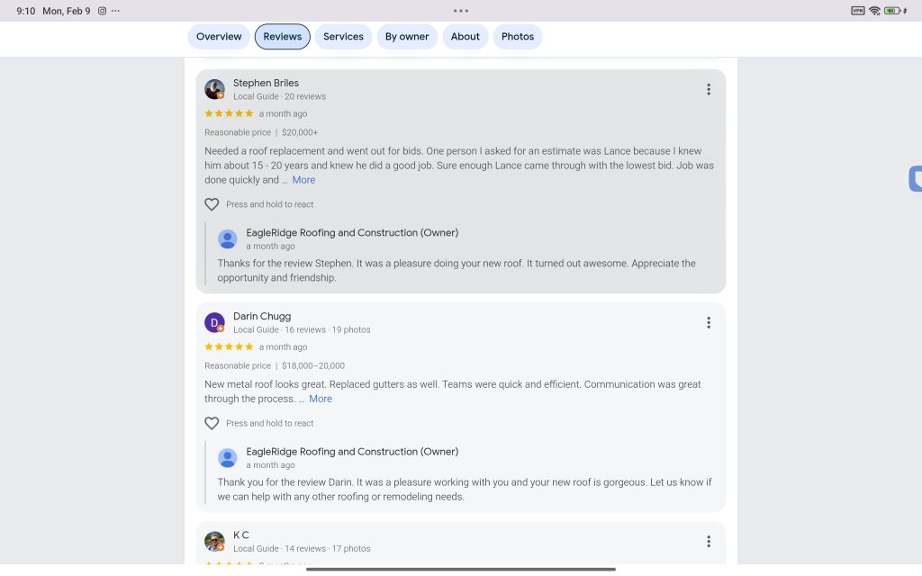 If you’re researching your options or simply want to understand what it’s like to work with EagleRidge Roofing & Construction, these reviews offer a transparent look at real experiences from real homeowners.
